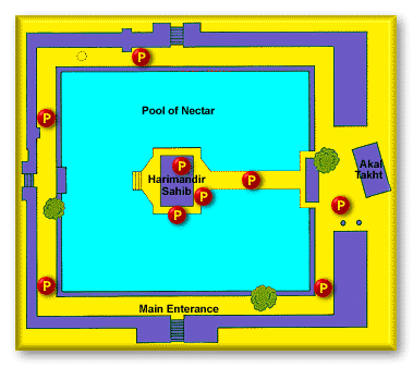 View striking panoramic images of the Golden Temple Complex which make you feel that your are standing there right now. The latest Immersive Imaging technology has been used to create these panoramic images. Netscape 3 or Internet Explorer 3 are minimum requirements to view these panoramics. Just click on any 'P' on the map below and wait for the image to finish downloading. When it appears, click on it and drag your mouse to the left or right to change your view.